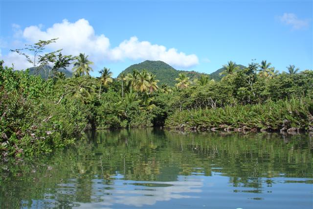 This photo was taken with a zoom lens. It took about an hour to row to the top where a bar had been created and we sat and drank the most beautiful Rum punch. Albert explained that many of the scenes from Pirates of the Caribbean 2 were filmed on the island and several on the river itself. We emerged from the river at dusk and the light took on an enchanting glow.