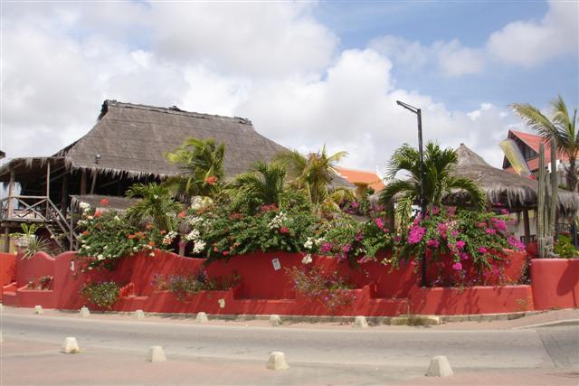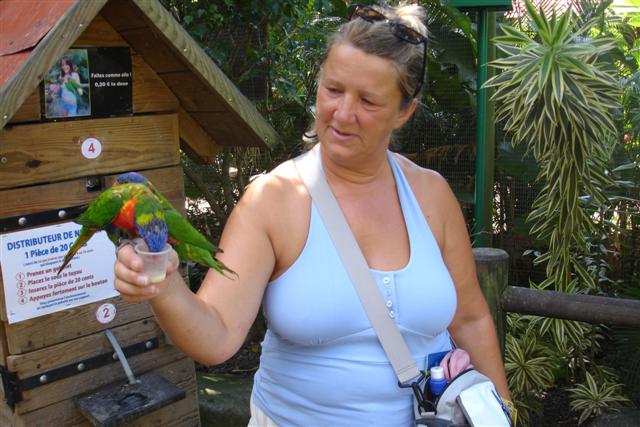 them they sent down their minibus for us. The gardens were beautiful with thousands of species of plants with everything from cacti to beautiful orchids and magnificent trees. There was a walk-in aviary where we could feed the brightly coloured paraqueets from little cups with a kind of liquid that they seemed to love. There were also some beautiful rosy flamingos standing around one of the numerous ponds. We spent several hours wandering around the path that meandered through the gardens to enable you to see it at its best. Many of the species that were growing freely in the gardens could only be houseplants in the UK, and they were growing beside huge banana plants and other specimens. We sat in the beautiful restaurant over looking a superb waterfall and beyond to the Caribbean sea where we enjoyed a delicious lunch together. We spent a bit of time in the gift shop and bought Bill a new hat (another one) and me a beautiful pair of sandals made of shells (more shoes!)
