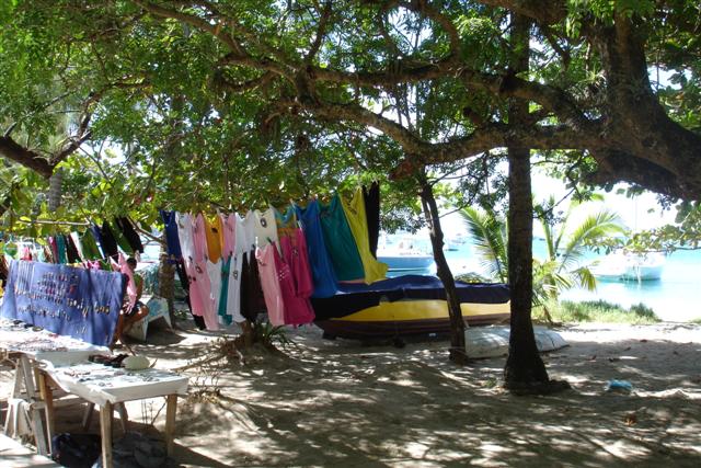 We sailed around the East side of St Vincent to pick up a better wind. We put in a reef while sailing across the gap in a F6. It took most of the day to sail past the island. The wind gradually died in the afternoon and by 3.30pm we had to put the engine on. We arrived at the island of Bequia at 5pm where there were quite a lot of BWR yachts. The next morning we went ashore to check-in with the customs and immigration, which would cover us as far as Union Island. Port Elizabeth in Admiralty bay is Bequia’s only town. There were some colourful buildings along the waterfront that contained every thing one needed, restaurants, shops, supermarkets, several chandlers (which had to be inspected closely!) and a great indoor market. We got chatting to a Rastafarian running his stall while another one was asleep under it. I bought some lovely fruit but I probably paid a lot more than I ought to have. As we walked backed along the waterfront vendors were selling t-shirts hanging from lines in the trees. In the afternoon we took the dinghy across to the Devils Table and snorkelled over some rocks with beautiful fish amongst them. In the evening we went for a meal with Enchantress, Lucy Alice, Briet and Bionic to a restaurant called Coco’s place. There was a live band playing and we had a really good evening. Most of us went back to Enchantress, a Scottish boat, for ‘a wee dram’ after. |