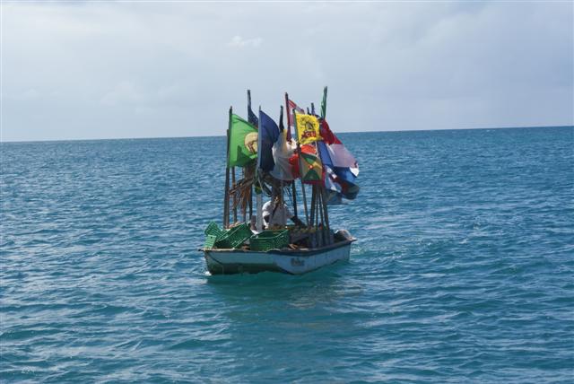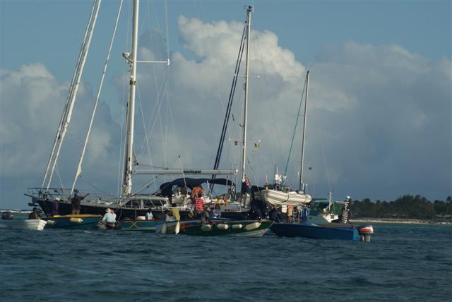 Monday morning we left the beautiful Tobago cays and motored across to Union Island, picking our way carefully through the gap between the reefs. I walked up to the airport to check out and get our clearance papers. Then I wandered around the market buying fresh fruit and veg for the sail to Bonaire. Unfortunately for one of the BWR boats called Roundabout, there’s a reef in the middle of the harbour that happened to be called Roundabout Reef. David managed to run aground on it but as he was backing off boat boys suddenly surrounded him. They all put lines onto his boat and started pulling in all directions making the situation worse. I heard him calling for help and quickly ran to the café where I knew Blue Magic and Jackamy were sitting. Mark and Paul ran to their dinghies to go and help. Fortunately David was off by the time they got there but the salvage negotiations were just starting. After long talks the US$3000 came down to EC$800 about £200. David was very lucky. |