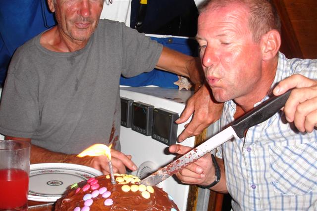Our usual Dolphin escort appeared for half an hour or so in the afternoon. There was a nice F3/4 blowing from behind and we travelled 127 miles in the first 24 hours. By 22.00 on the second night the wind had picked up to a F7 and we reefed the sails down. We did 159 miles in the second 24 hours. Although it was good to have a fast passage it meant we were going to arrive in the dark. We tried to slow the boat down a bit but with such good winds she raced forward. Fai Tira caught us up and went on ahead. We rounded the headland at 2.00 in the dark and crept up to the moorings. Fai Tira had found a buoy and we followed slowly and picked up a buoy too at 3.45. Time for bed.