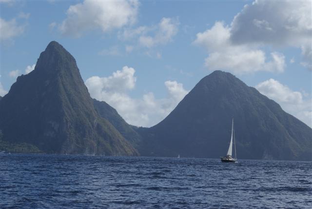| The next morning we left early to sail to St Lucia. Once clear of Martinique we put the sails up and had a great sail south. St Lucia is an independent nation with a British tradition; it’s very mountainous and lush. We arrived at Rodney bay at lunchtime.