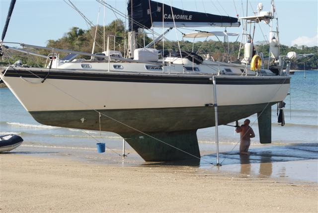 The next day we moved to the anchorage between Chapera and Mogo Mogo, these 2 islands had been the setting for the TV series ‘Survivor’. We were looking for a beach to put Camomile up on her legs to dry out and scrap her bottom before the Pacific crossing. Mogo Mogo looked like a possibility.