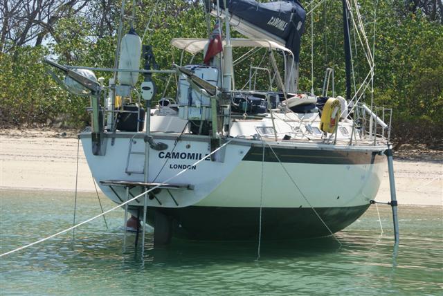 There was a group of rocks sticking out of the water that marked the end of a reef, at low water it looked like it could take a bite out of a yacht. This was opposite a peninsular at the end of the island. The channel in between was deep enough for us at high tide. We already had the ‘legs’ attached to the side of the boat so we motored very slowly towards the beach.