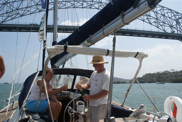It was an emotional moment as the lock gates opened and we got our first view of the Pacific. It was 13.06 and the next part of our adventure was beginning. As we motored under the bridge of the Americas the champagne corks were flying.