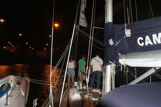 As we approached the first one, Pedro Miguel lock, we joined together in our raft again. We had heard on the radio that Gaultine III was catching us up but we weren’t allowed to wait for them. Miss Tippy and Blue Magic rafted together and we entered the lock. We were lowered 30feet to the Miraflores lake, a small artificial body of water that separates the two sets of locks. We motored across together in our rafts to the Miraflores locks. We waited 40 minutes in the lock for Gaultine III to catch up which enabled us to wave at the webcams but I don’t know whether any one saw us. There wasn’t time for Gaultine to join their raft so they had to tie alongside a small pleasure vessel that joined us in the locks. We were lowered to sea level in the last two locks.