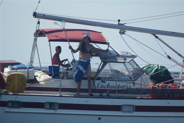 then came the buckets of water and then finally they opened cans of beer and tipped some over the bow of their boat and drank the rest. It was all a lot of fun. The funniest part of the afternoon was when Ian turned round to go back on deck and the wind got up lifting his dress to reveal nothing underneath. His excuse was that, as he couldn’t fit into any of Glenda’s kickers he thought he wasn’t allowed to wear any! After the fun we continued on our journey because we still had another 100 miles to go. Lucy Alice, Enchantress and Briet were able to sail and they adjusted their speed to match ours, their support was invaluable. We arrived the following day having motored 491 miles in 104 hrs. We had used all our jerry cans of fuel but we still had our mast.