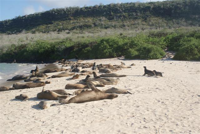 The island contains one of the largest sea lion colonies. A trail runs alongside the coast and then crosses through an Opuntia Forest. The Santa Fe species of land iguanas are larger and of a paler yellow than on the other island but we only saw one. On our way back we walked passed the sea lions lying on the beach with out a care in the world and they weren’t the slightest bit bothered by us wandering amongst them.