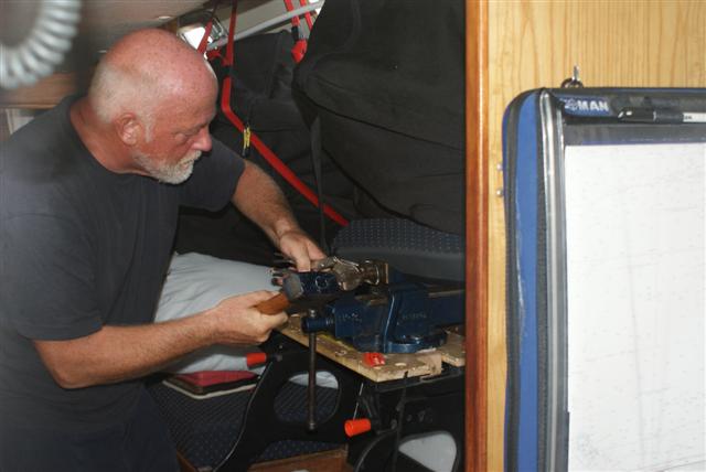 During this time I was carrying out regular checks on the state of the jury rig but my observations were leading me to believe that it was weakening. I could see through the “mummification” of line that one of the shackle pins had started to bend. I knew that this is a favourite pre-failure mode for shackles so I had to do something about it. I did not have a spare toggle assembly so I dug deep into my tools and bits locker and found just the thing I needed, a piece of 5mm thick flat bar. As I carry a heavy engineer’s vice and a club hammer on board (subtly had no place here) I soon fashioned this into a “make do” toggle at least as strong as the original one if not quite as pretty. Fitting this would stop
