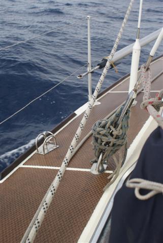 took more 14mm line and passed turn after turn after turn up and through the chain plate and rigging screw body not so much to reinforce the shackles but in an attempt to dampen the shock loads going into them. This done I tightened the 20mm lines winch by winch bending the shrouds into tension back and across the boat. The result was a cat’s cradle of creaking lines but it held and the mast finally now stood straight and fast.