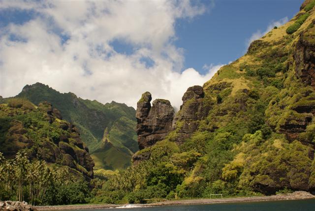 At long last we sighted land, the island of Fatu Hiva in the Marquises. Its bulk rose out of the pre dawn gloom with soaring and ragged volcanic peaks covered in lush green vegetation fed by the rich volcanic soil and watered by the heavily humid wind releasing its rain as it was forced up hundreds and hundreds of feet for the first time in thousands and thousands of miles.