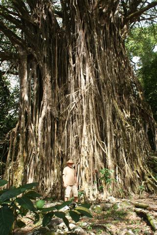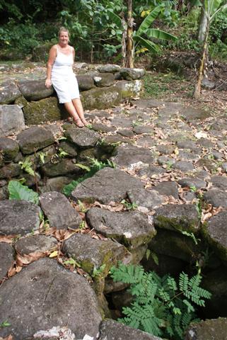 The Banyan tree in the photo is a famous one that’s featured in many books because when it was discovered by the first missionaries it was full of skulls. We continued through the jungle to find many more me’ae sites some with ancient hiamoe or sleeping platforms watched over by sculptured stone tikis or phallic fertility statues that keep the secrets of the ancient rites once practised there. The site is among the largest and most intriguing in the Marquesas and as with all archaeology I found them fascinating. Richard was very informative but intrigued at my interest in everything. We drove back across the island to the boats.