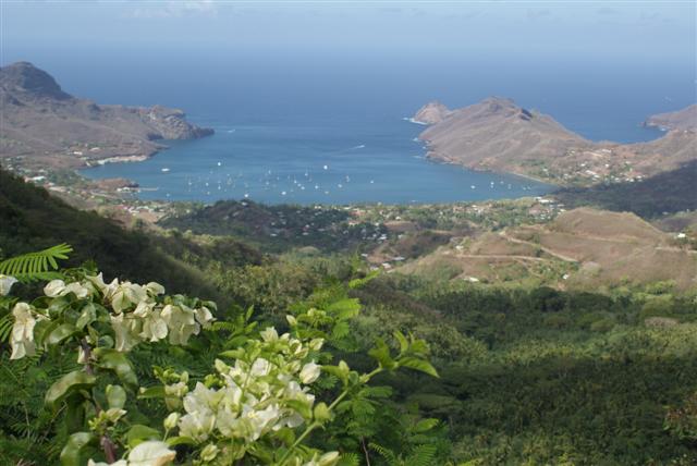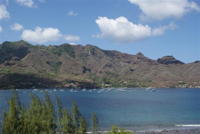 The best way to see Nuka Hiva is by 4×4 vehicle so on the Wednesday the crews of Enchantress, Fai Tira and Aspen (USA) joined us as we got into 2 vehicles and set off with our guide Richard to see the sights. We started off by driving up the Muake at 864 meters high for a sweeping view across the bay. We continued on to Houmi past the vanilla plants that grow wild across the valley to stop to look at a magical church on the banks of Controller bay. We zig-zaged back up the winding road to Taipivai, whose ancient warriors were cannibals, for a magnificent view out to sea with the island of Ua Pou in the distance.