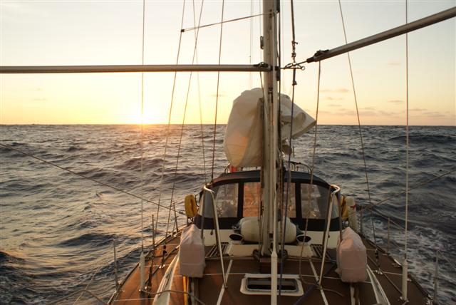 vicious wind in them that we had experienced in the Atlantic so we found, once the twizzle rig (twin 135% heavy Dacron genoas flown from the forestay foil on poles) and the Hydrovane wind pilot were set we had very little daily sail adjustment to do. We have been really pleased with the twizzle rig and it made us smile whenever we listened in to the little group of boats in our area on the HF radio net comparing notes and hints on sail plans. They were trying this sail plan or that, flying spinnakers, rigging cruising chutes from the back of the boom, poling out this way or that and when it came our turn we had to confess; yes that we still had the twizzle up and hadn’t so much as touched the sheets for the last 24 hours!