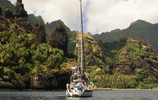 In the afternoon we sailed to Daniels bay a couple of miles along the coast. There wasn’t much room but we all managed to squeeze in. We went ashore in the evening for a bbq and a sing-song but we all looked like german dancers as we kept lifting our feet to slap the flies off our legs. In the morning a lot of the crews went ashore to walk to a waterfall but after seeing the stunning one in Fatu Hiva we decided not to join them and Bill set about his jobs list instead. We sailed back to Taiohae bay in the afternoon.