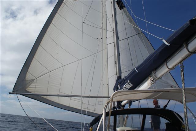 Even so the rolling motion from a following sea was there but at least it was missing most of that sharp flicking motion of the Atlantic and we just moved on with a warm wind of between F3 and F5 over our stern day after day making slightly more northing that we needed to stay on the rhumb line. We paused the twizzle rig only twice on the voyage, broad reaching with the cruising chute to bring us back on track.