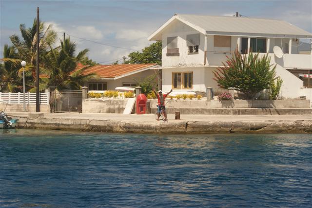 We stayed for 2 days but then decided to move on to see another atoll. We left together and motor-sailed back down the lagoon to the passé. Enchantress went through first followed by Lucy Alice and then it was our turn. The ebb tide pulled us out with hundreds of fish beneath us. Fernando waved us off from the quayside as we sped by.