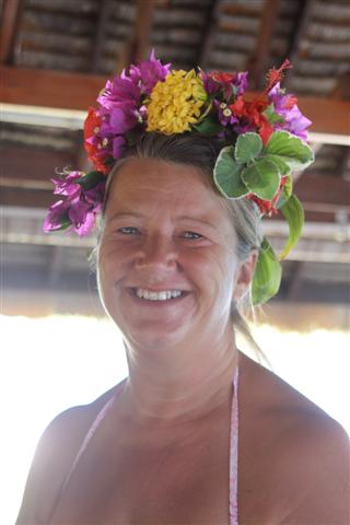 We anchored next to the Club Bali Hai, a lovely resort that allowed us to use their pool and facilities. The next morning the ladies were invited over to the resort for a demonstration of how to make the beautiful Polynesian flower crowns, here is ‘Mama’ showing my friend Susan how it’s done.