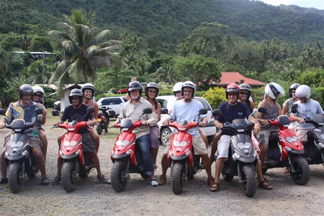 We continued around anti clockwise until we came to the Tiki Village Theatre on the western side. Polynesians love to dance, sing and play music but most of all enjoy performing on stage. We decided to stop for some lunch, which meant we were entitled to watch the afternoon performance. They put on a great show including more ideas for tying the pareo. Afterwards we were invited to join in, we all had a great time. We had a look around the village in the afternoon before continuing on our way. We had been told about a beautiful waterfall on the south side of the island. We found the track leading to it and the men decided to ride the mopeds up them. By this time the rain was coming down heavily and the track was very muddy. We left the bikes and walked some of the way but abandoned the idea after realising it was still a mile or two away.