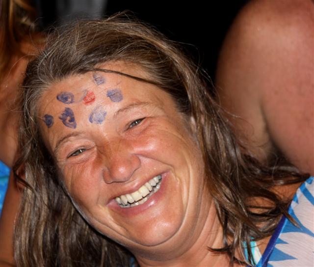David decided he was going to have a go too and also failed. The dots on my face were from another game I don’t even remember playing but I obviously got it wrong!! Neither David or I could sit up and Bill had to take us back to the boats in our dinghy while towing Susan in theirs. I don’t remember a lot but There were a lot of sore heads in the morning!!