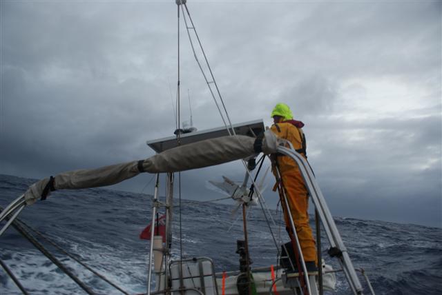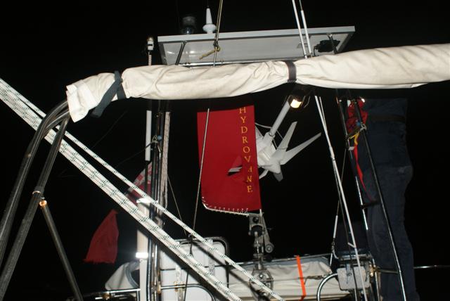 Day 4 Up until now our wind generator nicknamed “Wendy” (when de wind blows) had been able to supply all our power with no need to run the engine to top the batteries up but that was all about to change. At 03:00 she fell backwards off her perch on the aft gantry and still spinning attacked Harry (our Hydrovane wind self steering gear). At a stroke we had lost both our steering and our power supply. Why do these things always happen in the dark of the early hours? I powered up the electric autopilot and reluctantly woke Sue so she could back me up as I left the cockpit to deal with the mess at the stern. Wendy weighs in at 15 kilos and the sea was still pitching and rolling us a lot so I decided it was too dangerous to deal with this in the dark. I stabilised the situation by lashing her to the gantry and disengaged the self steering drive.