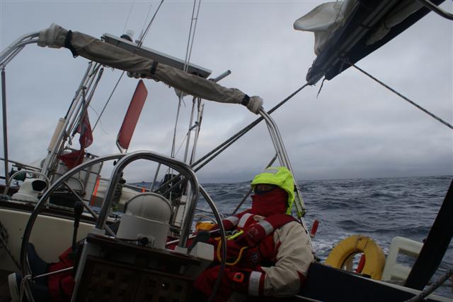 Day 2 As we romped along through the big seas well forward of our beam we logged our position and speed against Bob’s voyage plan, which was already proving to be very accurate. This was encouraging because it was forecasting for both the wind and sea to drop to more sensible levels. Sure enough, right on time, the wind eased slightly and, some time later, the sea followed it. Even so, it was still hard work and very wet on deck as we topped waves with breaking crests they would swoosh across the deck and even got past the spray hood, dripping down the companion way making it damp down below where there was little ventilation as all the hatches and vents were sealed. I decided to put my dry suit on so that I could nap on deck overnight during Sue’s watch to be ready to react if we took a rogue wave or encountered some other excitement.