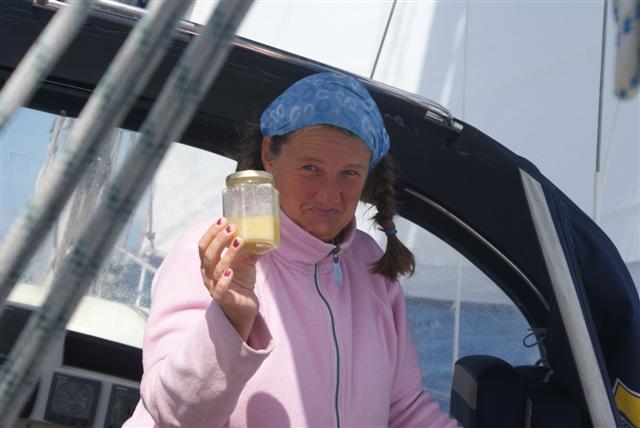 Full foullies on today with long sleeves and socks, it’s turned so cold, we’re just not used to this. We’re gradually using up any food the NZ customs are likely to take away. I used the last eggs today and my last tin of M&S chunky chicken. I won’t be able to eat the last of the honey, which is an absolute no-no in NZ. You can just picture the scene; SAS in full combat with guns pointed ‘Put the honey on the pontoon and step away from the jar’. So it went over the side!