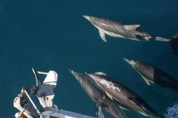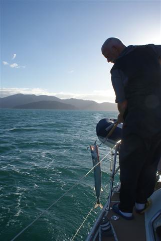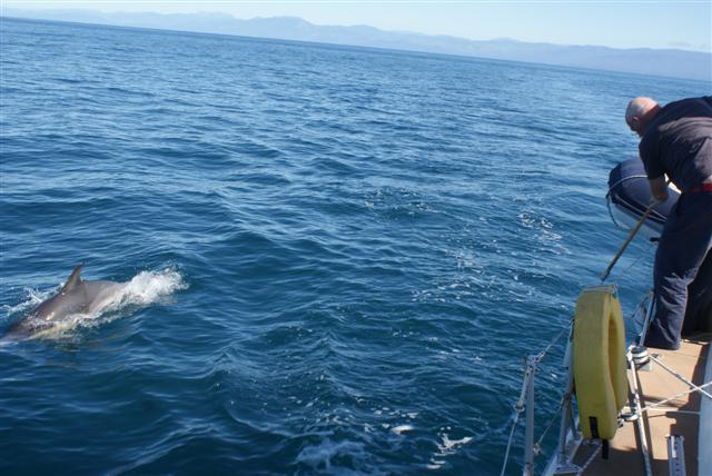 The Able Tasman was as far west as we were going in this latitude, the next time we will be on 173 east will be when we are on our way to Vanuatu. We left the next morning to cross the Tasman bay. It was a beautiful day but no wind so the engine was on. Bill put his fishing line out to try and catch some fish. He kept catching blue cod, which we didn’t want because they are very difficult to fillet but he caught one after another and kept putting them back. Then the dolphins arrived and kept trying to steal them, it was very funny watching Bill telling the dolphins off and cursing every time he brought the line up to find another blue cod. I don’t think he’s ever caught so many fish before, I think the final count was eight. Eventually he caught a Terakihi which was delicious.