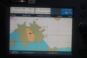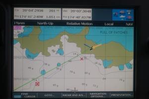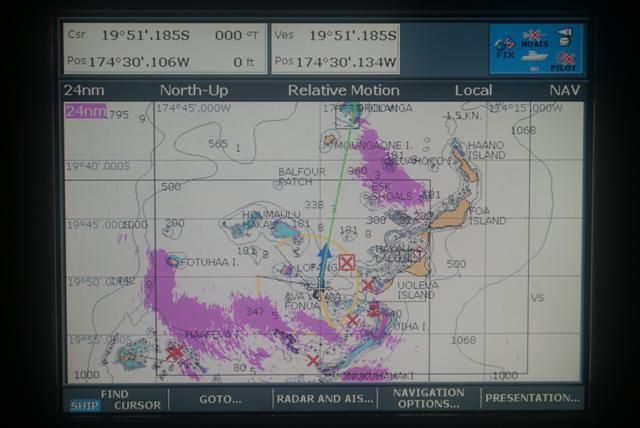 We spend the next few days visiting the islands of Uoleva and Pangai picking our way through the reefs to get to them. On the way to Pangai we encountered a mammoth thunderstorm. The forecast was for showers but after we set off the rain started getting heavier and it quickly became a tropical storm. We tracked it on the chartplotter and thought we had avoided it, the pink areas are storm clouds, but it turned at the last minute and crossed our path. The heavens just opened and it poured with rain. It was difficult to see more than 50 feet in front of us so we stopped the boat because we were too near the reefs. Fortunately it cleared within half an hour and we were back in the sunshine.