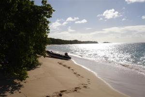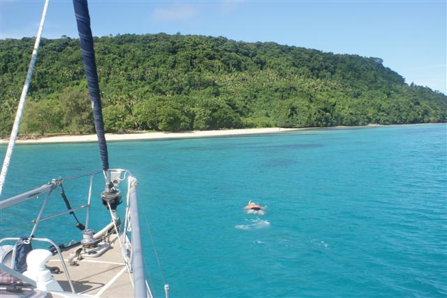 Sunday 15th May was a nice example of a day doing nothing in the tropics. We woke about 8am with the boat rocking quite badly in the swell. We had intended to go to church with Peter from the plantation but there was too much swell coming into the anchorage to leave Camomile at anchor so we had to leave. We left the same way we had come in the day before with our newly acquired fruit swinging in the new hammock Bill had set up under the solar panel. We had bacon and eggs for breakfast as we watched deserted islands slide by.