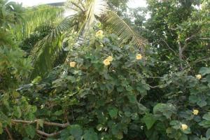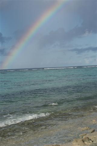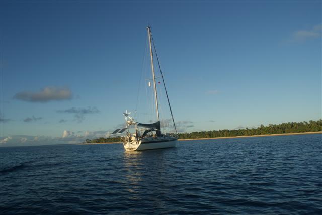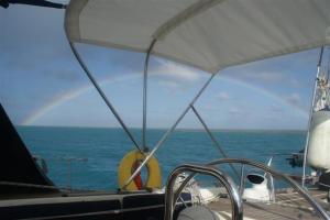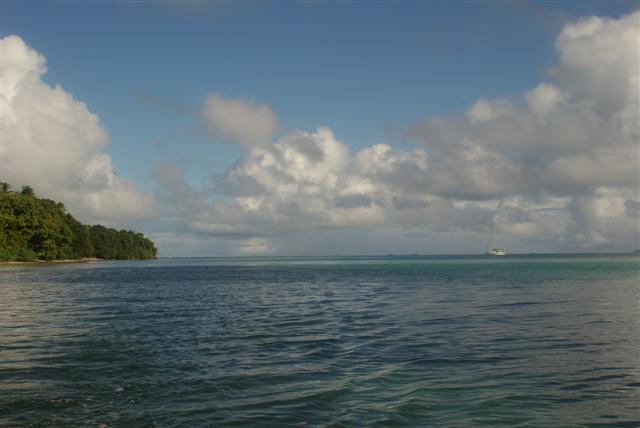 We anchored next to Tafata, which was uninhabited. I baked some bread for lunch alongwith some flapjacks, although it was 33C under the cockpit. We dinghyed over to the island and landed on the beach. It was mostly composed of shells and coral and it glimmered in the sunlight. We walked the two-mile circuit around the island, clothes were optional as usual, and it took about an hour. I collected quite a few unusual shells just lying in the sand, beautiful shapes and colours. On the far side of the island we watched the crystal clear water breaking over the reef and ending up in little ripples by our bare feet. We had a little shower of rain, which resulted in the usual beautiful rainbow. The island was covered in luxuriant green Hibiscus plants growing wild along the water line. We noticed some animal footprints in the sand and a bit further along came upon a wild pig but he ran off when he saw us.