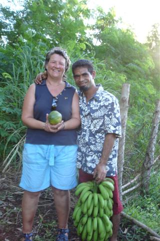 We continued along the ‘street’ and came upon some local ladies stripping leaves preparing them to make ‘Tapu’ cloth. They were happy to show us how they did it. They were also running a little shop where I bought some eggs. No egg boxes though they just placed them in a plastic bag. I managed to get them back to the boat without breaking them.