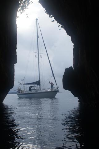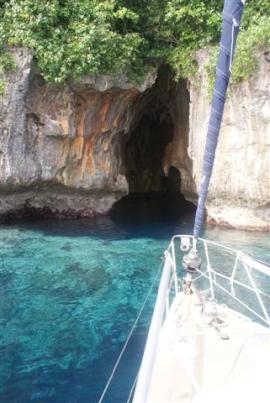 We spent over three weeks in the Vava’u group but before we returned to Neiafu there was one last spot we wanted to check out, Swallows cave. Near the cave the depth is more than 40 metres so anchoring is impossible, there’s also a lot of coral around the edge so care needs to be taken. We poked Camomile’s bow in as close as we dare to take a look but then Bill’s dropped the dinghy so I could go inside while Bill stood off. The intense blue of the deep water was stunning. It was very dark inside and sadly covered in graffiti although some of it dates back to whaling days and so has a certain historical value.