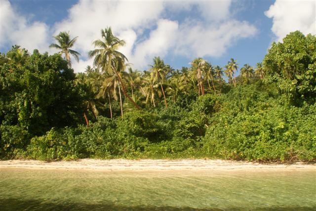 The anchorage off the beach was well sheltered even though the island was on the edge of the outer ocean reef. Beyond it was the South Pacific ocean with nothing between South America and us. The island is overgrown brush and trees, yet the beach is very attractive. At low tide the undercuts in the limestone are revealed. We found a path leading from the beach to the other side of the island.