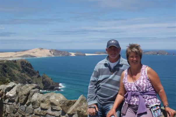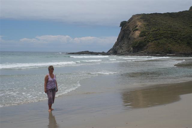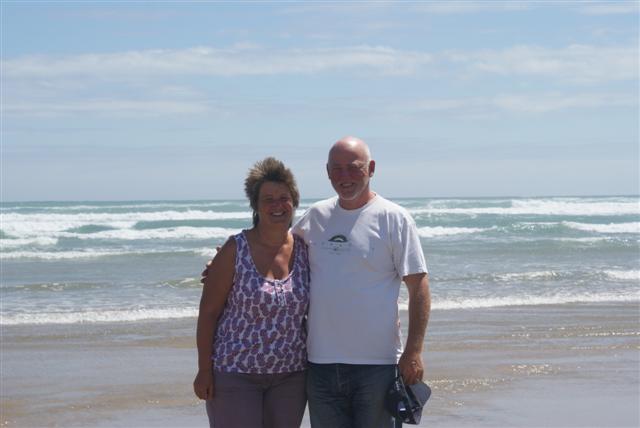 We travelled back down on the same road for about 10 miles before turning off towards the Te Paki sand dunes. We were met with an incredible sight of 60ft high sand dunes. The driver issued us with toboggans and, after a short instruction of use, said, “Follow me.” Climbing the sand dunes was like wading through treacle; you needed to take a dozen paces forward to get one pace up. It was one of the hardest things either Bill or I had attempted. We congratulated ourselves that we were the only ‘older’ members of the bus to try it, except for Norman but he’s very fit so doesn’t count! Eventually I made it to the top, the driver sat me down and told me to hold on and keep my feet up and gave me a good push.