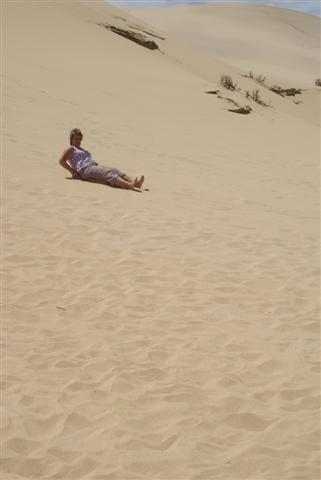 I came hurterling down at an alarming pace. I was almost at the bottom when I was worried I wasn’t going to stop so put my foot down …… I was absolutely showered in sand, it was every where – hair, ears, bra, knickers, mouth, I decided not to attempt the climb a second time! Bill managed to get up a bit quicker than me but also found it very difficult, he also made the same mistake as me and put his feet down. We didn’t want to end up in the stream at the bottom. When every one had had their fun the driver performed his party piece. He ran and jumped onto a boogie board face down and hurtled down the sand dune, across the stream, right down to the door of the bus amid cheers from his audience.