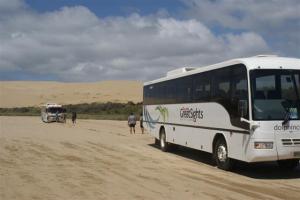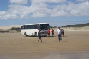 The Te Paki stream flows past the sand dunes through to 90 mile beach providing a path for the buses to drive through. Throughout the day the driver had been warning us that the stream is drying up and quicksand patches are forming that the buses were getting struck in. He assured us this wouldn’t be a problem because there were several big guys on the bus that day and he had little spades for the rest of us! After the tobogganing we all got back on the bus to drive through the stream that the driver said needed to be driven fast. We came around the corner and did indeed find one of the buses stuck. The driver went to see what was happening then got back on the bus and told us to hang on tight. We thought he was joking again but he meant it. He turned the bus round and drove back a few hundred yards then turned again, he picked up speed and must have been doing 40-50mph when he hit the quicksand area. The bus slowed right down but he kept going and we got through. There were about 5 other buses that all did the same thing. They then tied all their towropes together to pull the bus that was stuck out of the quicksand.