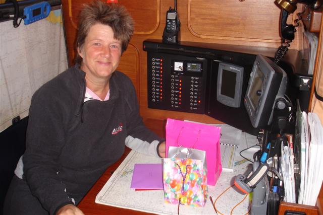 The wind went round to the south and we were off. We got the engine off at 20.00 last night and have been sailing since. We spent the night rolling around in a moderate sea and everyone was tired on the net this morning. Today was my birthday and although Bill had very sweetly hidden a couple of little presents for me, it wasn’t much of a birthday. I even had to get up earlier than my usual watch time because Bill wasn’t feeling well. Never mind, we’ll save the celebrations for when we get in. Bad hair day!!