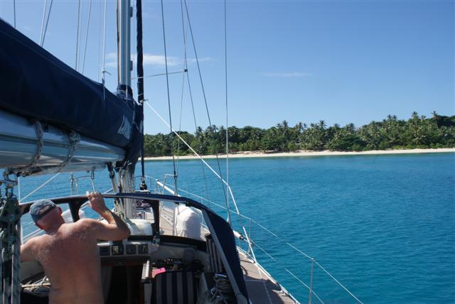 We had a better nights sleep and this morning we shook the 3rd reef out of the main and let out all of the genny. Later we shook out the other 2 reefs and were sailing really well in a nice F4 – why couldn’t the whole trip have been like this? At 11.30 I spotted land; oh no it’s the island of Ono!! The air temperature is 28C and the sea is 26.9C, oh yes!!