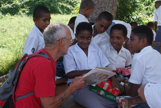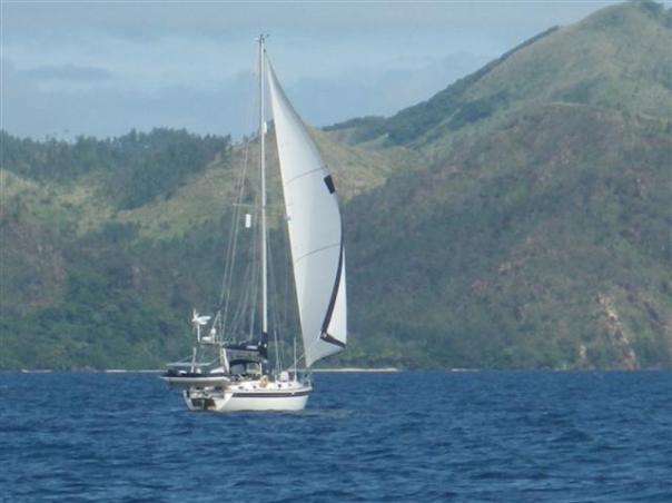 We had 365 miles to go to Suva – a Biscay crossing roughly and rough was the right word because the wind was still blowing 20 – 25 kts outside the reef with 3 – 4 metre seas. Fortunately it was coming from behind us so it wasn’t too bad. We still had 3 reefs in the main and Bill controlled the speed by winching the Genoa in or out. The Hydrovane was having trouble steering when we surfed down the waves so we had the autohelm on as well. Bill also had to hand steer. We reached 9.3 kts once as we surfed down one of the waves and I was doing a very good impression of a meercat just popping up now and again to see if the seas were dropping. I kept Bill fed and watered.