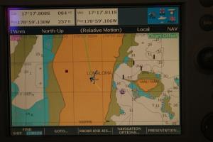 On Tuesday we sailed around to Lomaloma for supplies. The chartplotter is all over the place here and can’t be trusted. This shows the screen with Camomile sitting in the middle of the island instead of by the mauve symbol, which was our actual position.