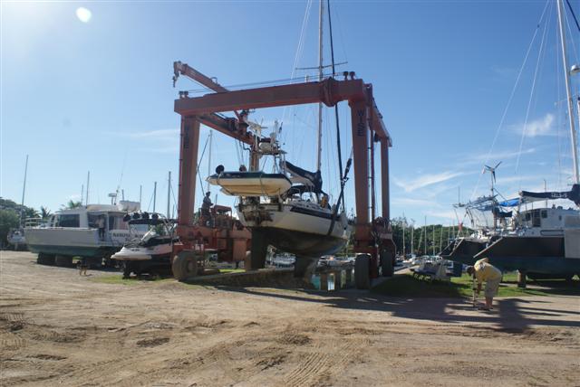 Tuesday 19th we arrived at Vuda point marina ready to lift Camomile. Bill wanted to repair some patches on the Cuprotect and also we wanted to check the keel after hitting the reef in Kadavu. We lifted Camomile at Vuda point two years ago and found them very reliable but we were still a bit apprehensive.