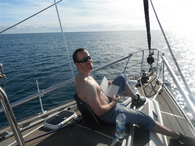 We had a good wind but unfortunately the sea was a bit lumpy and James took to his bunk. By the third day he was getting really bored but fortunately he managed to catch a yellow fin tuna, he managed to catch a second one but it got away. On the forth day James spotted land first and by 3pm we had motored around the south side of the reef and anchored in Anatom, James jumped straight in the water for a swim.