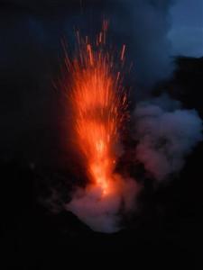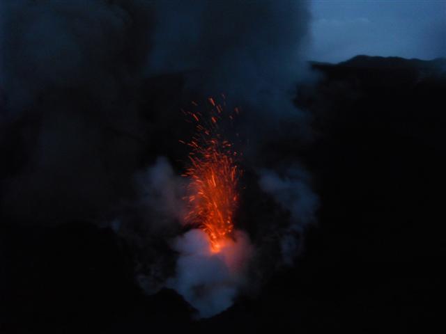 James was suddenly 5 years old again. Shrieking and yelling he took off at a run, hundreds of feet right up to the highest point of the crater. Sue and I, clinging to each other for moral support with me pretending not to be scared witless, made our way up about half way before we realised that the splodge shaped rocks strewn around the gravelly ash slope we were picking our way through could only have been created in one way. We stood our ground however and, as darkness gradually shrouded us, the explosive emissions of glowing molten rock gave us the show of our lives.