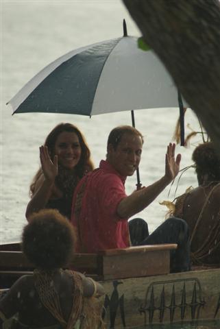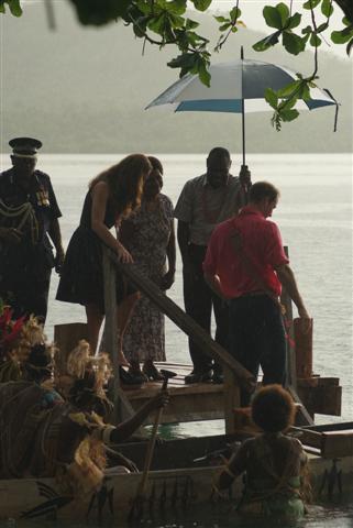 William and Kate got onto a beautifully carved war canoe with some local warriors who paddled them across about 100 metres to the island of Tavanipupu to the posh resort where they stayed the night.