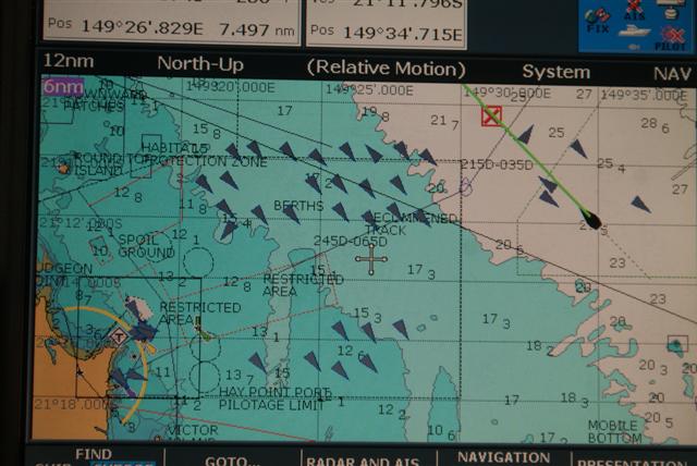 We sailed overnight from South Percy Island to Mackay arriving on Wednesday 1st May. Our friends Jackie and Gary on Inspiration Lady did the same. We arrived off of Mackay in the early morning to find lots of ships anchored in the approach. This is what the chartplotter looked like. Each of the grey arrows represents a ship and Camomile is the black arrow in the top right hand side of the photo.