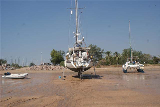 Darwin doesn’t have the same environmental issues that Queensland had and many of the rally boats have been landing on the beach to have their hull scrubbed. We decided to get Camomile’s ‘legs’ out and join them. We landed on the beach at 9am this morning and by 10.30 most of the hull was exposed so Bill and Norman could start scrubbing.