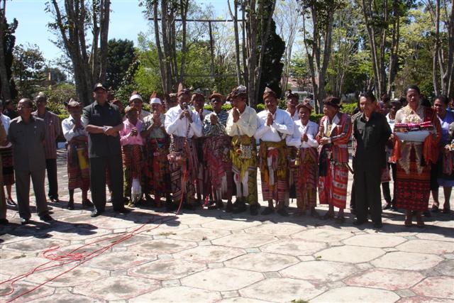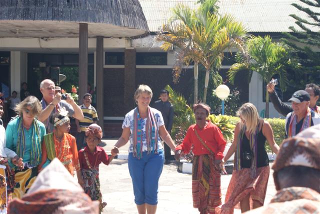 Saturday 3rd August we had a relaxing day until we went ashore in the evening for the Gala dinner, the highlight of our visit to Kupang. As we arrived in the dinghies the throng of people were there to take our photos. I’m beginning to understand how the celebrities feel now. We were bused out to the outside of town to an open air venue. As we arrived they had Chinese dragons dancing. Wonderful food was served and then they had lots of local dancing, these young ladies had very interesting head dresses on.
