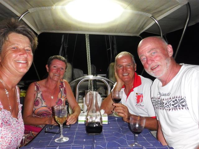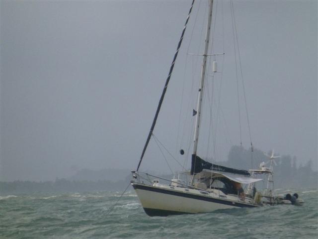 We managed to get back to the boat before the storm broke and raised the dinghy. Very soon the rain started, how it rained and rained and rained. At the same time the wind picked up to 30 then 40kts. The first boat to start dragging was Sailabout but there was nothing we could do but look on as they fought to get the anchor on board and re-anchor. The boats were all bucking like broncos and the rain continued to lash down. We were watching Calypso behind us and Labarge in front of us and they stayed the same distance from us. We thought that Out of the Blue II were motoring forward. I called Lyn on the radio to ask if they were motoring forward but she replied they were still anchored that meant only one thing – Calypso, Labarque and we were all dragging our anchors towards the island.