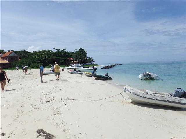 it’s the nearest one to the resort the other two are just behind it. The resort listens to VHF16. It was only 3pm so we decided to go ashore and see how much they were going to charge us. It turned out they didn’t charge for their buoys or even to anchor they just charge MYR25 (£5) per person per day conservation charge. For that you can tie up to their jetty, snorkel their beautiful coral round in front of the resort, walk on the beach, and do what you like.
